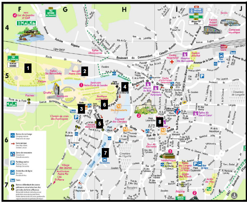 Dominantou města je bazilika Panny Marie Růžencové a podzemní bazilika Pia X. Poutní obřady zahrnují procesí se svícemi, mše, modlitby u pramene a koupání v léčivé vodě. Lourdes dnes žije převážně z poutního turismu a je symbolem víry, pokory a naděje.